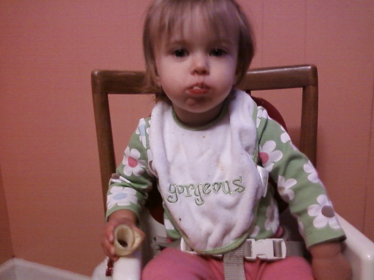 Salem loves bananas. She learned the sign for it awhile ago. This morning she had eaten a very good breakfast but then she saw me eating mine and decided she was still hungry. So back she goes into the booster seat for some banana. I cut off pieces for her, which she normally bites into smaller pieces, but this morning she shoved the entire thing in all at once. My little monkey!